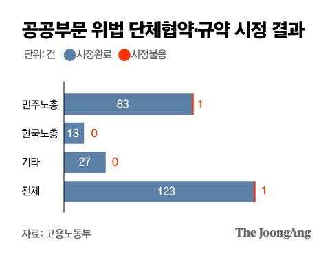 박경민 기자10일 중앙일보 취재를 종합하면 이같은 위법한 단협·규약을 두고 있던 전국 공공부문(공무원·교원·공공기관) 기관·노조 124곳(단협 120곳·규약 4곳) 가운데 123곳이 정부의 시정명령을 수용한 것으로 파악됐다. 구체적으로 민주노총 83곳, 한국노총 13곳, 미가맹 노조 등 기타 27곳이다. 민주노총 산하 전국공무원노동조합(전공노) 1곳만 노조 규약 시정을 끝내 거부했다. 단협은 사용자와 노조 간에 체결하는 자치적인 노동법규를, 규약은 노조의 자체 운영규정을 의미한다.