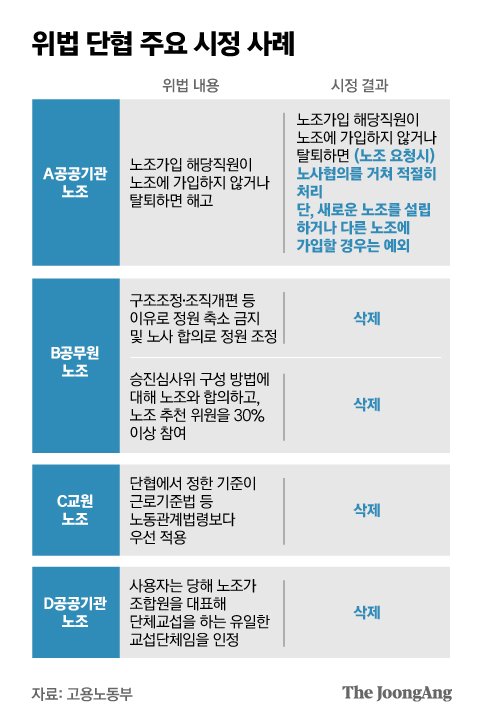A공공기관은 최근까지 노사 단체협약에 노조 가입 대상인 직원이 노조에 가입하지 않거나, 탈퇴할 경우 해고하도록 규정하고 있었다. B공무원 노조는 승진심사위원회 구성을 노조와 합의해야 하고, 노조 추천 위원이 30% 이상 참여하도록 하는 등 인사에 깊이 관여하는 내용의 단협을 소속 기관과 체결하고 있었다. 모두 위법한 규정이지만, 현재 정부 시정명령에 따라 법령에 맞게 수정하거나 삭제 조치됐다.